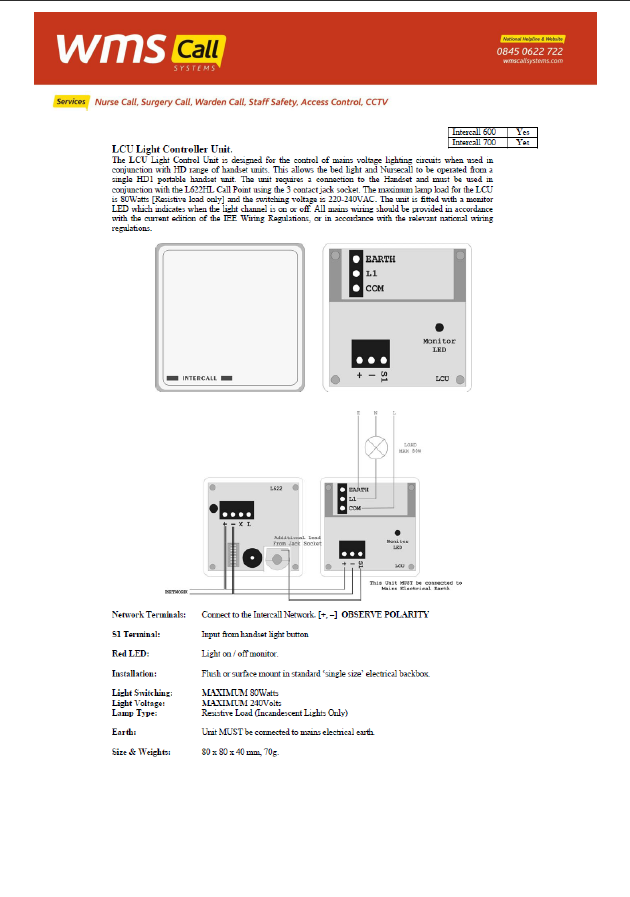 The LCU Light Control Unit is designed for the control of mains voltage lighting circuits when used in conjunction with HD range of handset units. This allows the bed light and Nursecall to be operated from a single HD1 portable handset unit. The unit requires a connection to the Handset and must be used in conjunction with the L622HL Call Point using the 3 contact jack socket. The maximum lamp load for the LCU is 80Watts [Resistive load only] and the switching voltage is 220-240VAC. The unit is fitted with a monitor LED which indicates when the light channel is on or off. All mains wiring should be provided in accordance with the current edition of the IEE Wiring Regulations, or in accordance with the relevant national wiring regulations