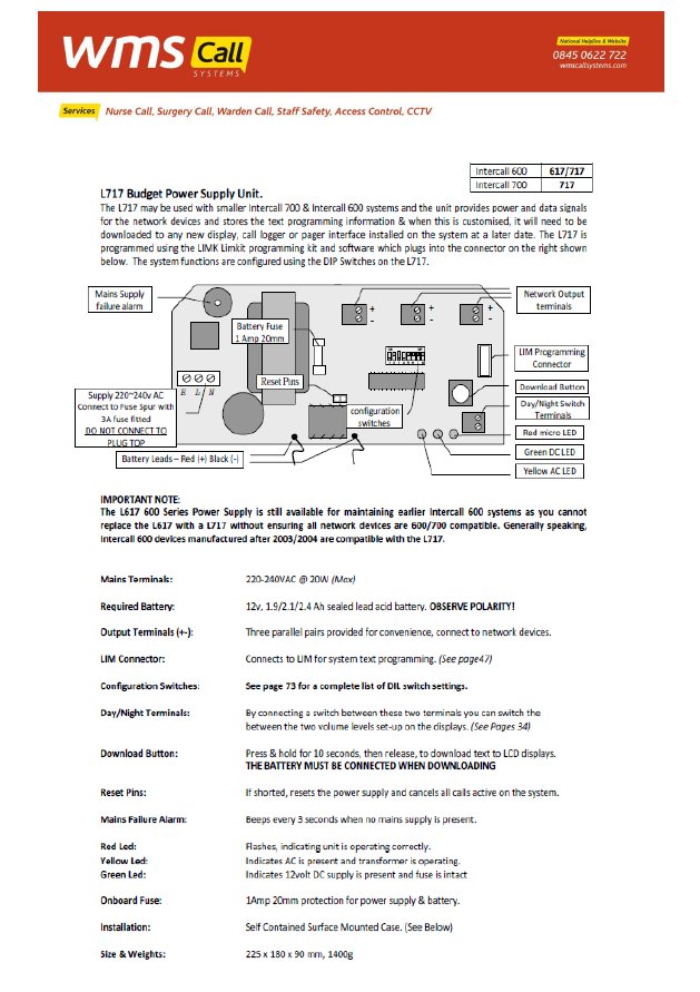 The L717 may be used with smaller Intercall 700 & Intercall 600 systems and the unit provides power and data signals for the network devices and stores the text programming information & when this is customised, it will need to be downloaded to any new display, call logger or pager interface installed on the system at a later date. The L717 is programmed using the LIMK Limkit programming kit and software which plugs into the unit. The system functions are configured using the DIP Switches on the L717