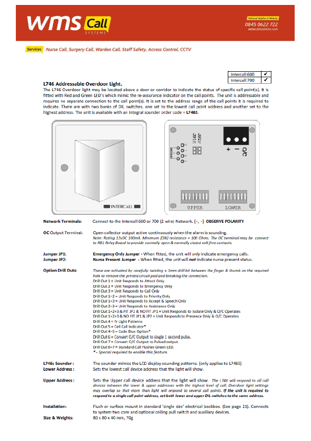 The L746 Overdoor light may be located above a door or corridor to indicate the status of specific call point(s). It is fitted with Red and Green LED’s which mimic the re-assurance indicator on the call points. The unit is addressable and requires no separate connection to the call point(s). It is set to the address range of the call points it is required to indicate. There are with two banks of DIL switches, one set to the lowest call point address and another set to the highest address
