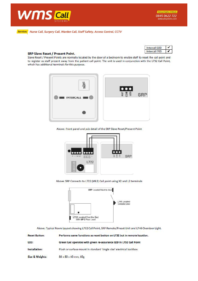 Slave Reset / Present Points are normally located by the door of a bedroom to enable staff to reset the call point and to register as staff present away from the patient call point. The unit is used in conjunction with the L722/L622 Call Points, which have additional terminals for this purpose